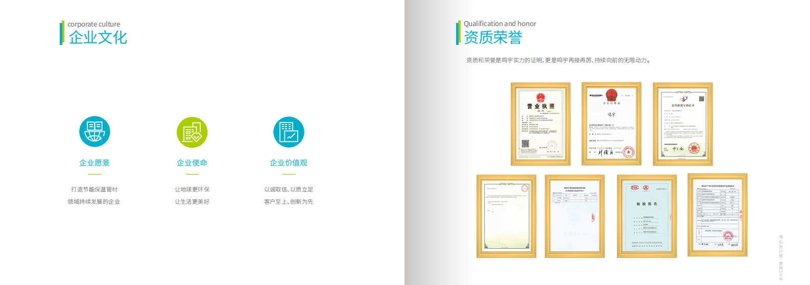 在“以诚取信、以质立足、客户至上、创新为先”的价值观驱动下,所有鸣宇人将不断追求极致的产品和服务,为打造节能保温管材领域持续发展的企业,而不懈努力。